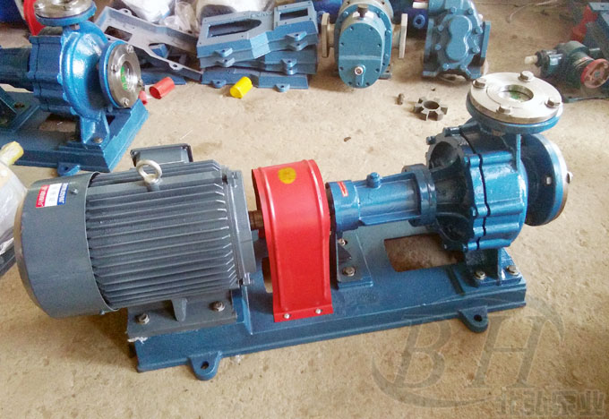 RY80-50-200風冷式導熱油泵泵蓋通過止口固定在中間支架上,然后通過泵體與中間支架止口的聯(lián)接把泵蓋夾緊在中間,泵體是軸向吸入,徑向排出,腳支承式,可直接固定在底座上。懸架部件通過止口固定固定在中間支架上,并用懸架支架支撐在底座上。為拆卸方便,設計了加長聯(lián)軸器,檢修時可以不拆卸進出口聯(lián)接管路,泵體和電動機。只需拆下聯(lián)軸器的中間聯(lián)接件,即可退出轉(zhuǎn)子部件進行檢修。這是國際上通用的一種結(jié)構(gòu)形式。
